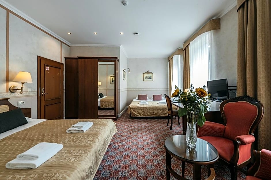 With a seating area, a mini-bar and a spacious bathroom with bathtub.